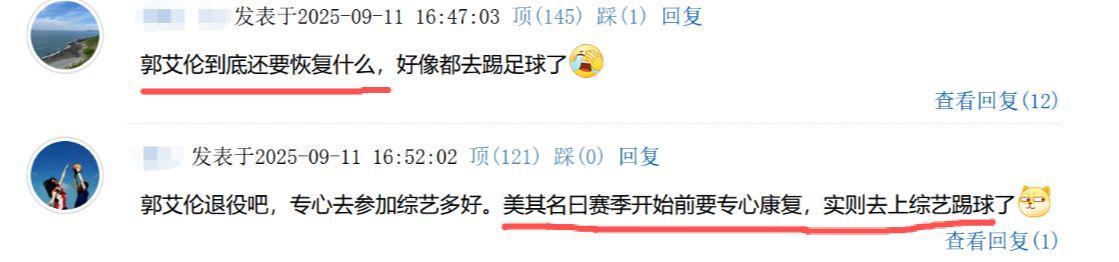 这边不归队合练,那边的东北明星足球赛,郭艾伦则是现身绿茵场,并且秀了一把自己运球突破到门前的好戏,这也引起了球迷的热议:“郭艾伦到底要恢复什么,好像都去踢足球了”、“综艺是主业、打球是副业”、“退役吧,专心参加综艺多好,美其名曰赛季开始前要专心康复,实则去上综艺踢球。”
