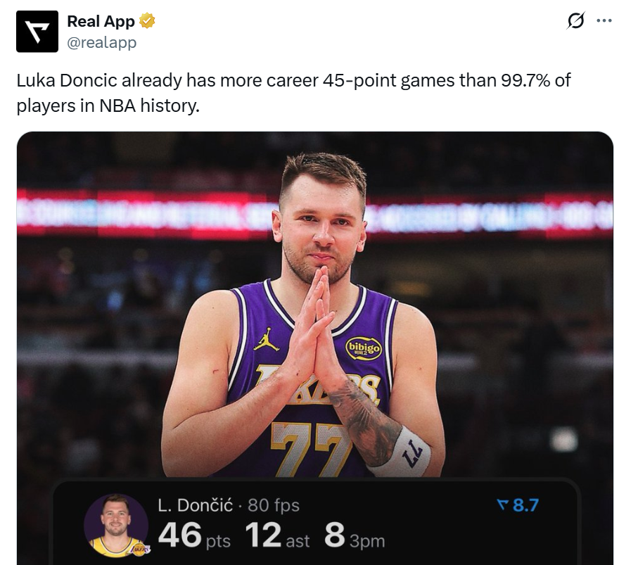 纪录四:本场是东契奇生涯第20次单场交出45+得分表现,成功追平利拉德、威少和贾巴尔并列历史第15名,已经超过NBA历史上99.7%的球员;