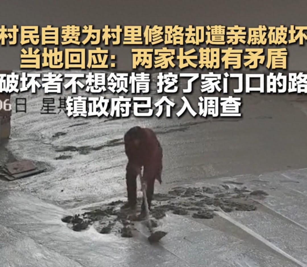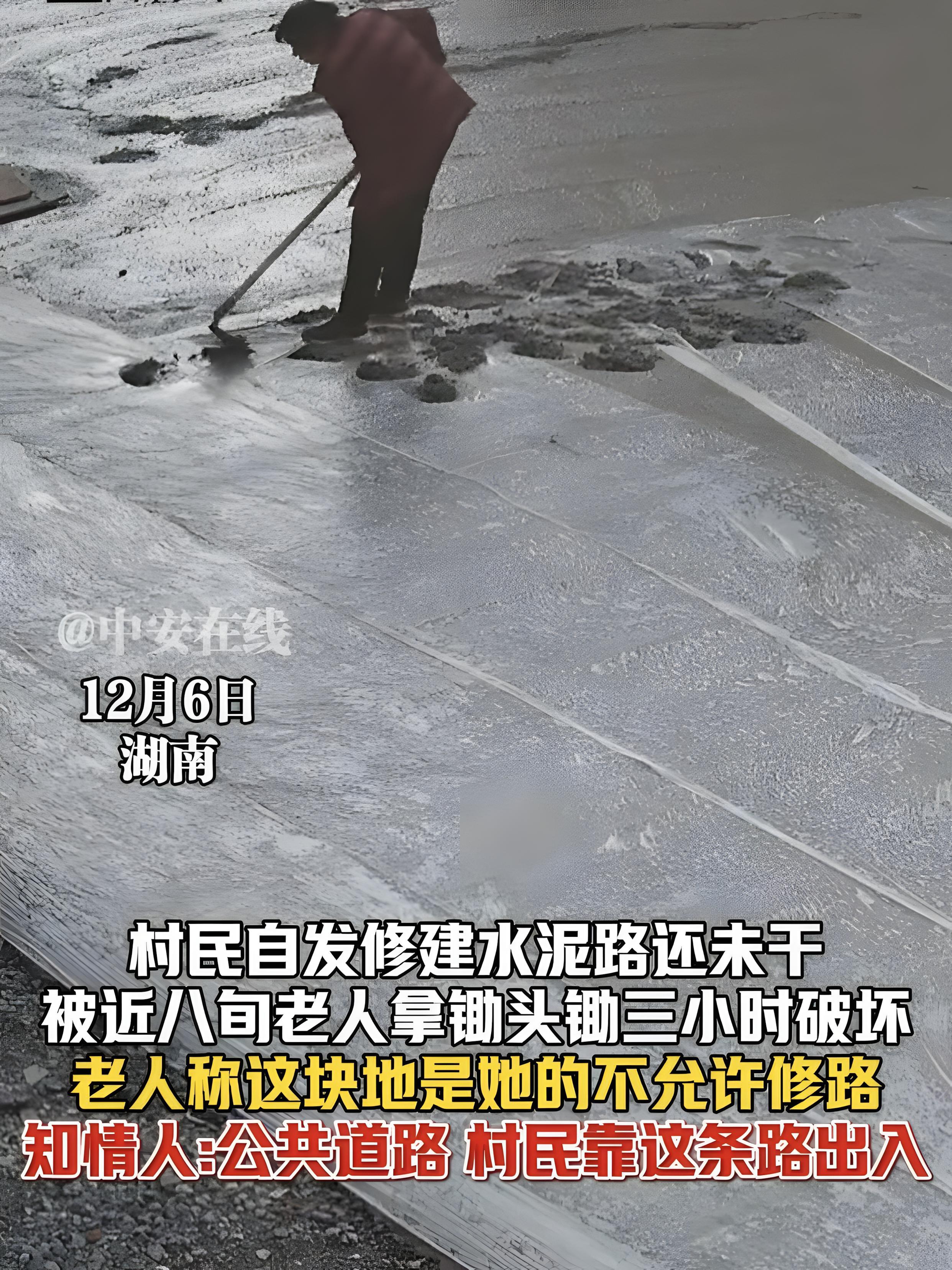 湖南邵阳新宁县一个小山村里,刚铺好的水泥路面还泛着新鲜的灰白色,就被一把锄头硬生生凿得千疮百孔。