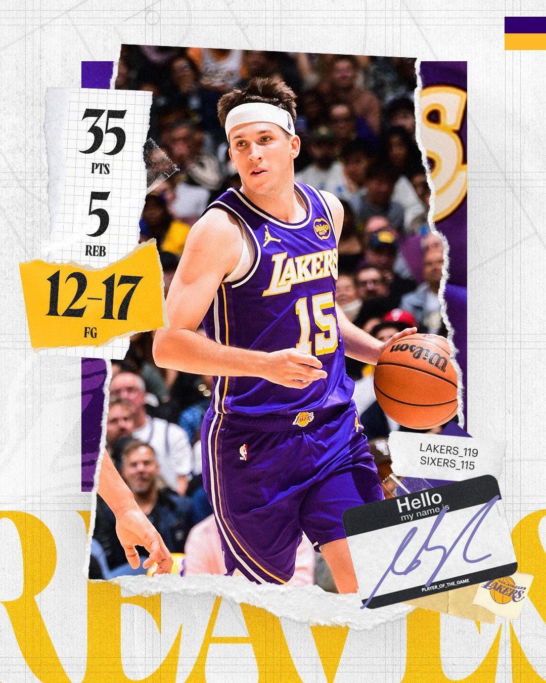 实际上,湖人现在真的值得期待,不仅仅是因为肯纳德的加入,还在于里夫斯的归来依旧是全明星水准,本场比赛,里夫斯出战24分钟,17投12中,其中三分球8投5中,得到35分6篮板2助攻。据统计,这是里夫斯第二次砍下35+且真实命中率超过85%,队史仅次于詹姆斯的4次,此外,本场里夫斯创下了湖人队史上得分超过35分但出场时间最少的纪录。