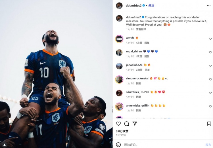 邓弗里斯也在赛后通过社媒晒出了德佩的庆祝照,并配文:“祝贺达成这一非凡的里程碑。你证明了,只要坚信自己,一切皆有可能。这是你应得的,为你感到骄傲!🦁🧡”